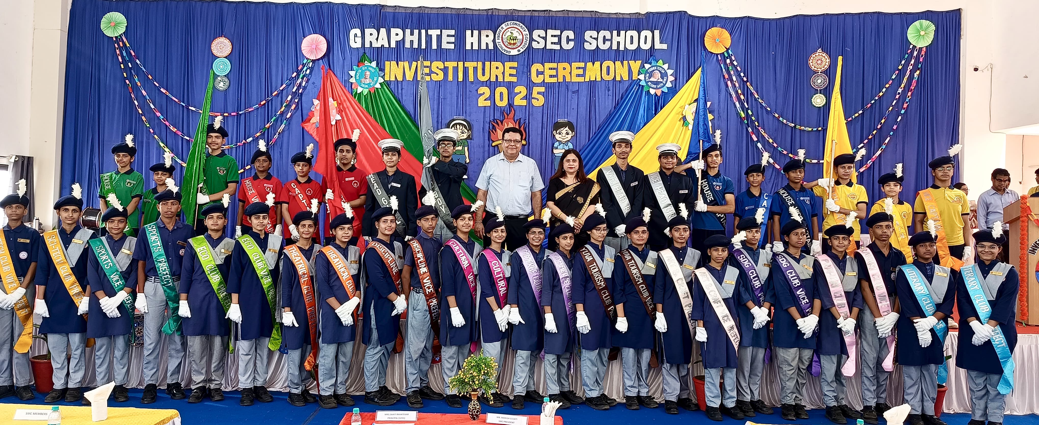 Graphite Higher Secondary School proudly celebrated its Investiture Ceremony, marking a significant milestone in the academic year. The occasion was graced by Mr. Manish Gulati, our esteemed SMC President and Chief Guest, who conferred badges and sashes upon the deserving student leaders. In his inspiring address, the Chief Guest congratulated the newly elected council members and encouraged them to perform their duties with integrity, dedication, and a strong sense of responsibility. His motivating words left a deep impression on the young leaders, urging them to strive for excellence. Principal Mrs. Swati Rahatekar extended a warm welcome to the Chief Guest and all the distinguished SMC members, adding a touch of warmth and respect to the solemn ceremony. She also congratulated the new council members and expressed confidence in their ability to lead by example and contribute positively to the school’s growth. The celebration was further enriched by a vibrant cultural program, where students showcased their talents through captivating performances. The event concluded on a high note, leaving the audience inspired and the student leaders motivated to embark on their leadership journey with passion and commitment.